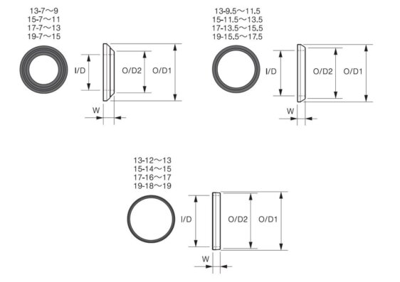 Size | I/D 1 mm | O/D1 mm | O/D2 mm | W1 mm | W2 mm |